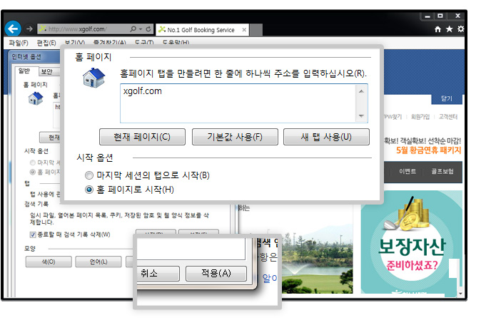 ȨÆäÀÌÁö ³» xgolf.com ÀÔ·Â ÈÄ Àû¿ë ¹öư Ŭ¸¯ ½Ã ¼³Á¤ÀÌ ¿Ï·áµË´Ï´Ù.